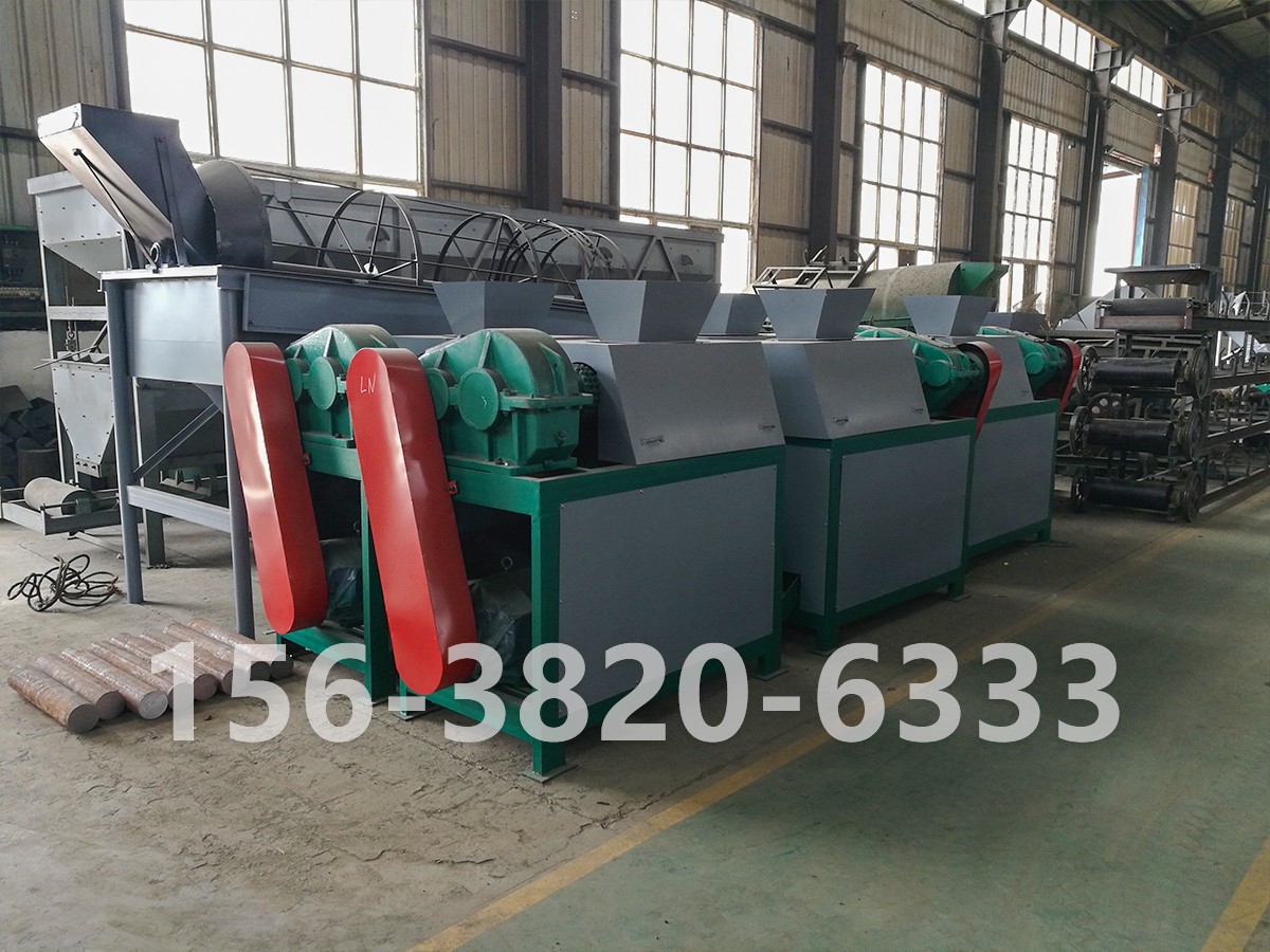 原料經(jīng)定量加料器均勻送入喂料斗, 壓實機(jī)利用帶有穴眼孔的成對軋輥,彼此留有一定間隙,兩者以相同的轉(zhuǎn)速作反向旋轉(zhuǎn)。其中一組軋輥軸承座在機(jī)架內(nèi)不動,而另一組軋輥軸承座則在機(jī)架導(dǎo)軌上游動,藉助液壓缸施壓使彼此緊靠。軋輥表面上有規(guī)則地排列許多形狀、大小相同的穴眼孔,且波谷對準(zhǔn)波谷。而此時干粉狀物料從兩軋輥上方連續(xù)均勻地靠自重及強制喂料進(jìn)入兩軋輥之間,物料先作自由流動,進(jìn)入咬入?yún)^(qū)后被軋輥逐漸咬入波谷。隨著軋輥的連續(xù)旋轉(zhuǎn),物料占有的空間逐漸減少而被逐步壓縮,并達(dá)到成型壓力 值。隨后則壓力逐漸降低,所壓得之型塊因彈性回復(fù)加之自重而脫落穴眼孔而進(jìn)入碎整粒、篩分裝置,所得成品為粒狀合格產(chǎn)品,進(jìn)行過秤包裝。而粉料口出來的細(xì)粉料和不合格的超大顆粒則由返料絞龍重新進(jìn)入提升機(jī)加料口隨同新鮮物料混合加入預(yù)加料斗而進(jìn)入下一輪工藝流程。